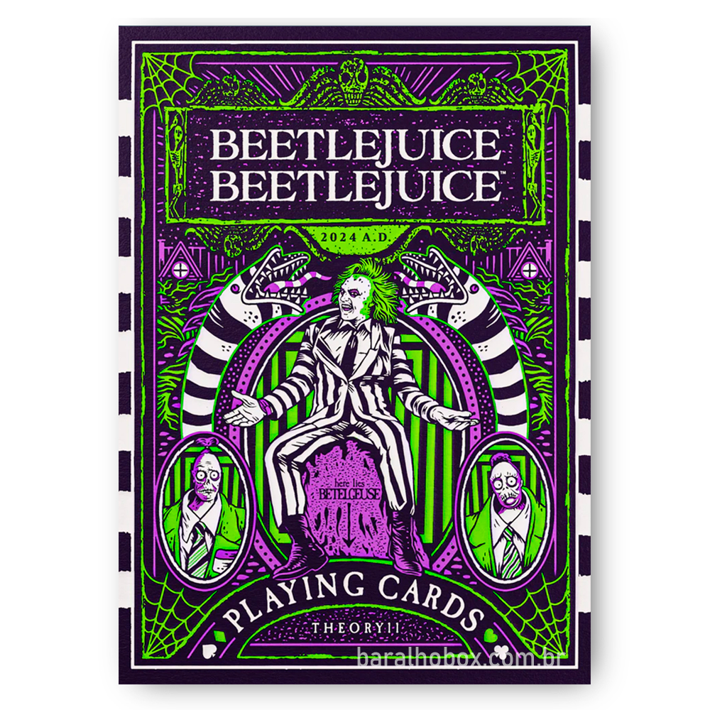 Prepare-se para ter o baralho indispensável para os fãs do clássico original e da tão aguardada sequência! Com tons vibrantes de verde limo e roxo assombrado, Beetlejuice está de volta dos mortos e pronto para exorcizar seu jogo esta noite!